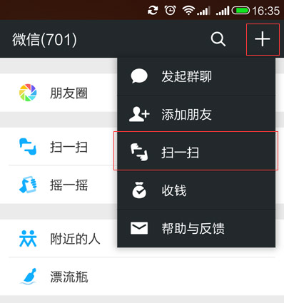 打開微信,在右上角+號(hào)功能選項(xiàng)中選擇 掃一掃